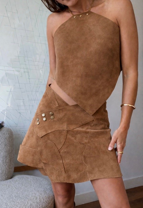 Falda rustica de cuero vacuno, realizada con retazos en su forma mas organica.