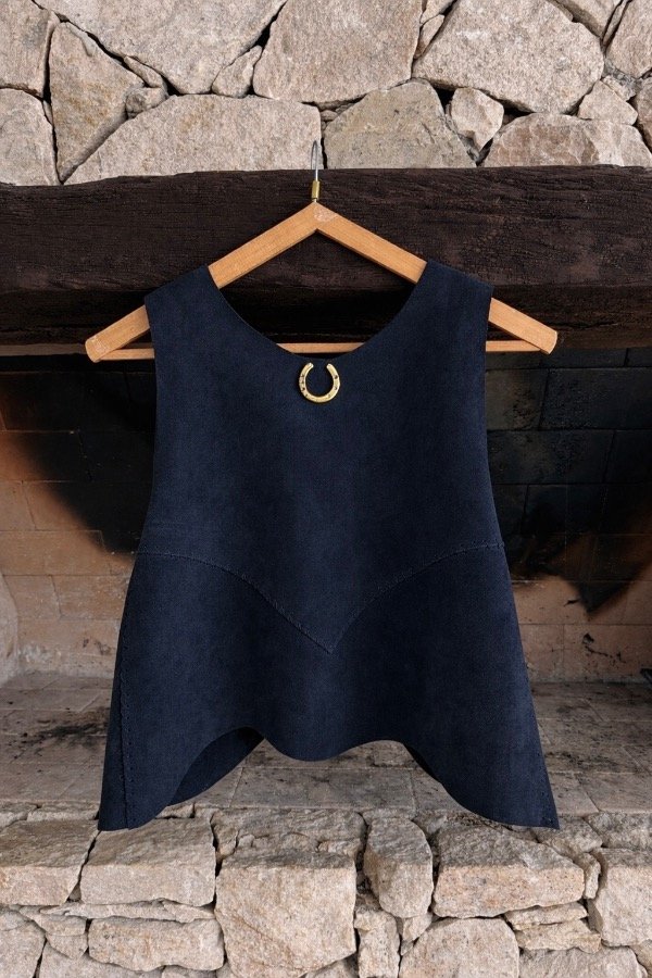 Pechera musculosa de cuero gamuzado, con trenzado en punta en el torso, y diseño trenzado en laterales.