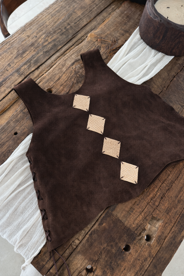 Pechera musculosa de cuero gamuzado, con diseño de rombos en cuero croco en torso y costuras artesanales.