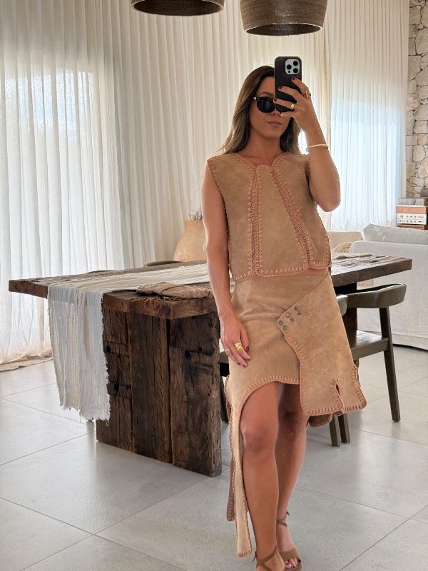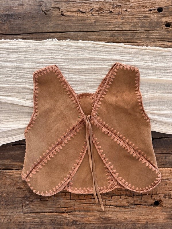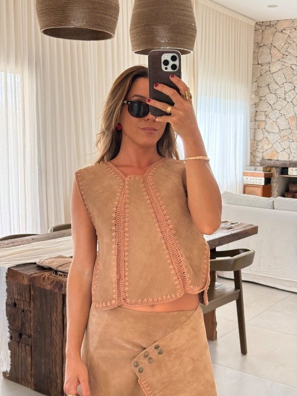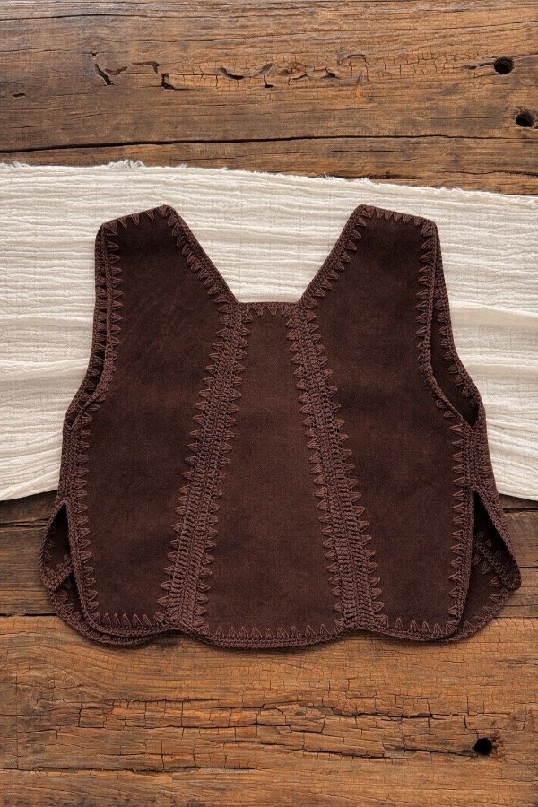 Pechera top de cuero gamuzado crop con uniones tejidas en hilo de algodón a dos agujas.
