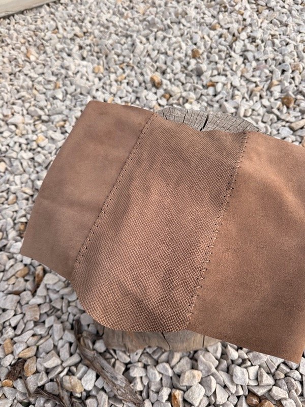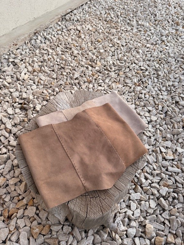 Mix de gamuza, cuero crudo, pelo vacuno, y cueros texturados.