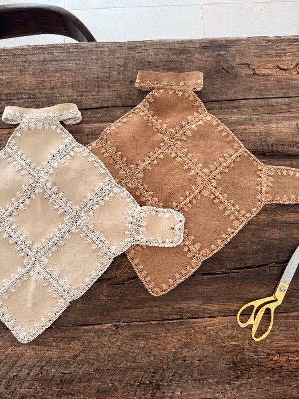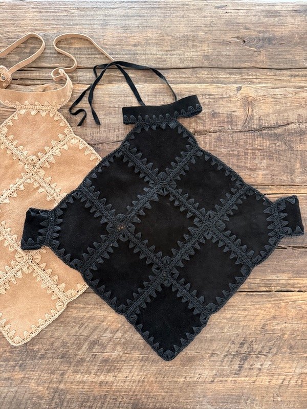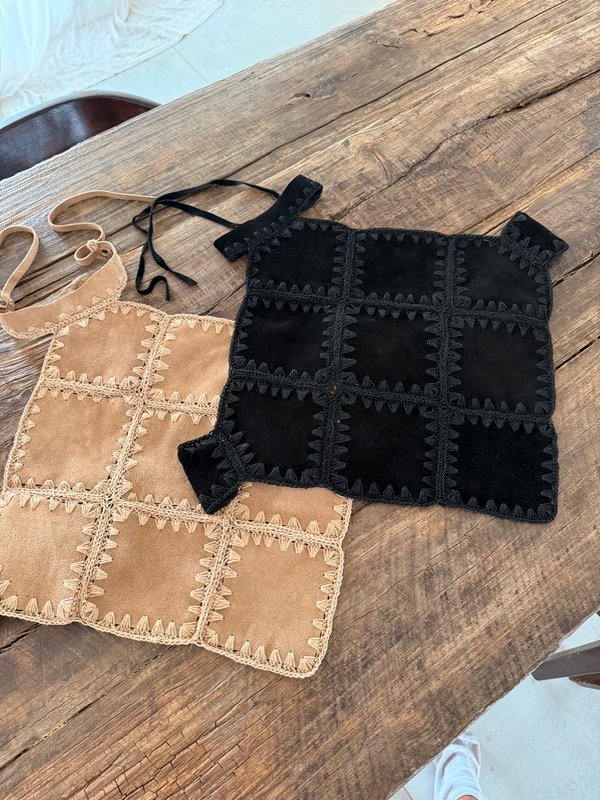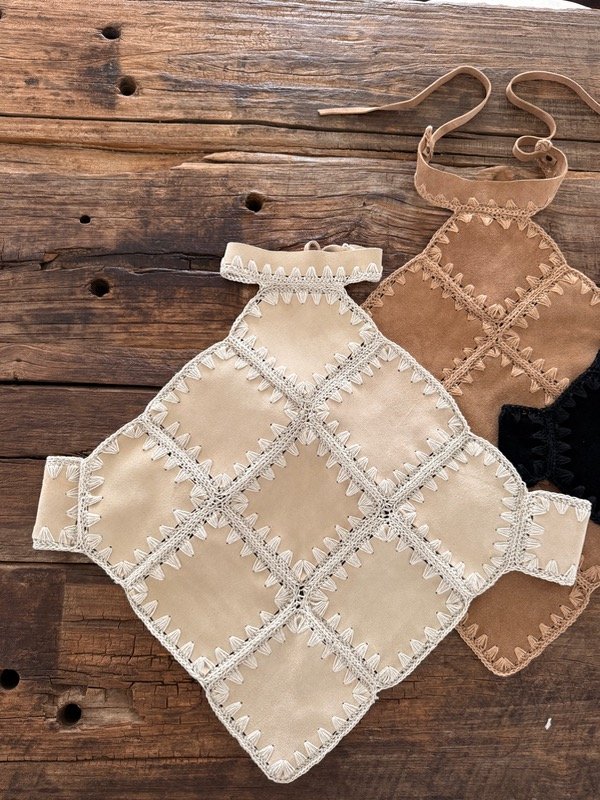 Top de cuero vacuno gamuzado, con terminaciones y detalles de tejido en crochet artesanal.
