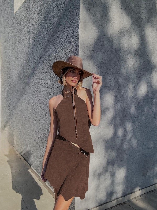 Top de cuero vacuno gamuzado, con cuello halter. Posee caída asimétrica hacia el lateral derecho, y espalda descubierta.