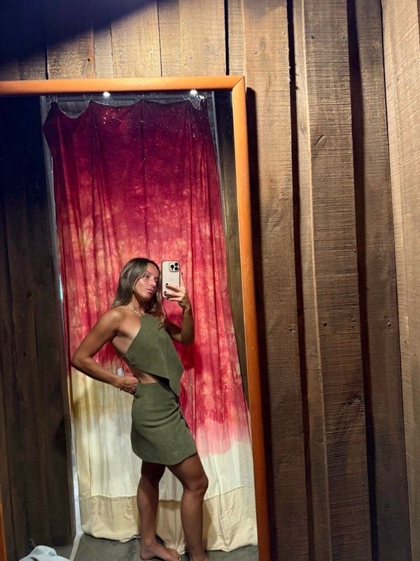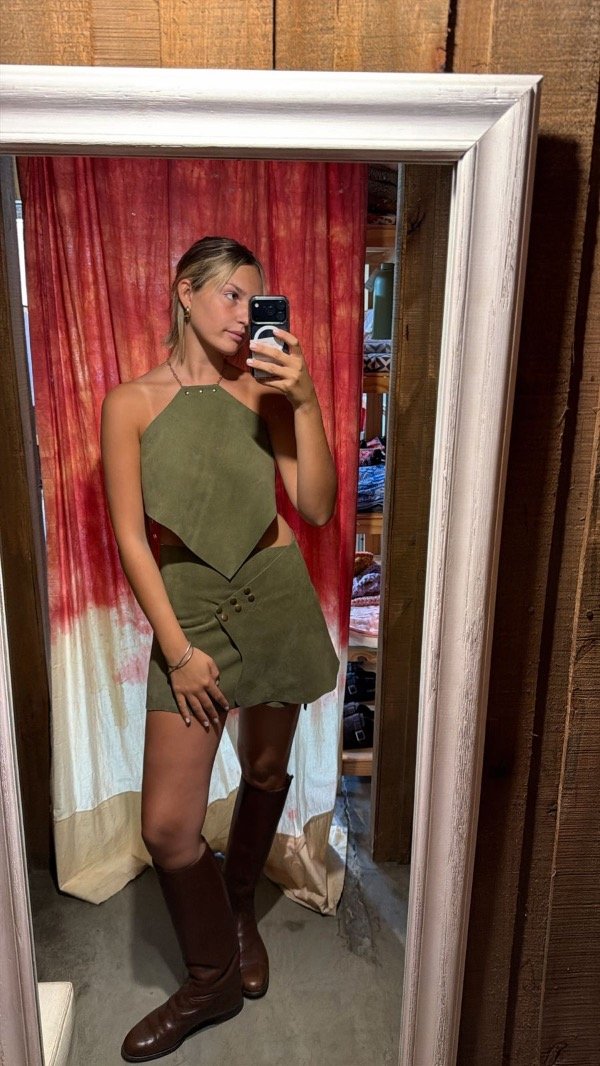 Top de cuero vacuno gamuzado, con terminación en pico y espalda completamente descubierta. Tiras en hombros con cadena, que cruzan en espalda y caen sobre los laterales.
