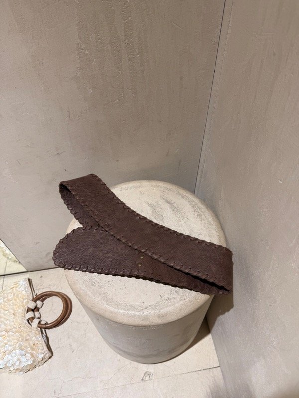 Con detalle de tientos de cuero trenzados al rededor de toda la pieza. Con un leve pico en uno de sus laterales.
