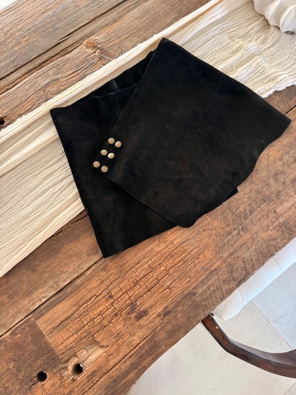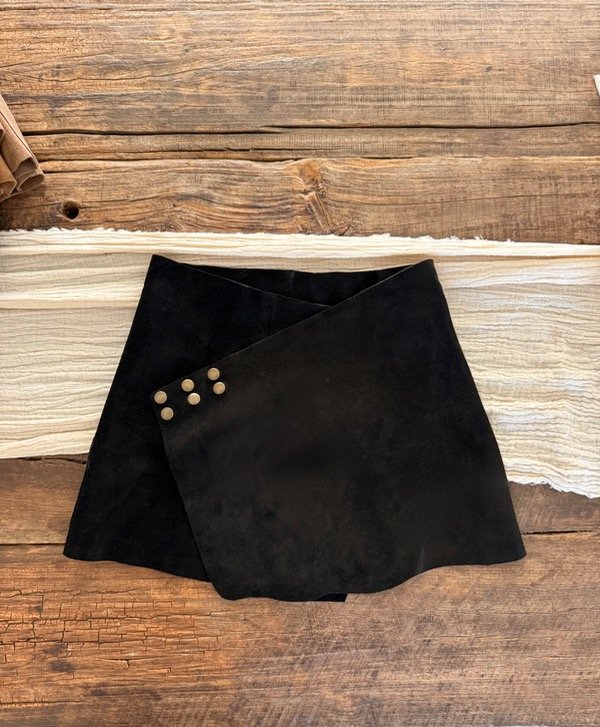 Pollera de cuero vacuno gamuzado. Rústica y asimétrica. Con broches de ajuste en dos distintas medidas. Solapa de cierre inclinada con caida.