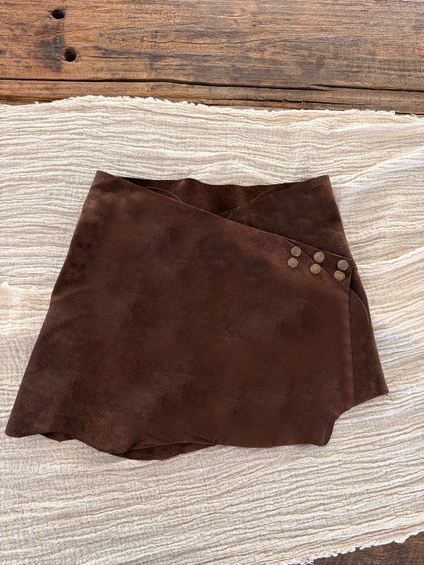 Pollera de cuero vacuno gamuzado. Rústica y asimétrica. Con broches de ajuste en dos distintas medidas. Solapa de cierre inclinada con caida.