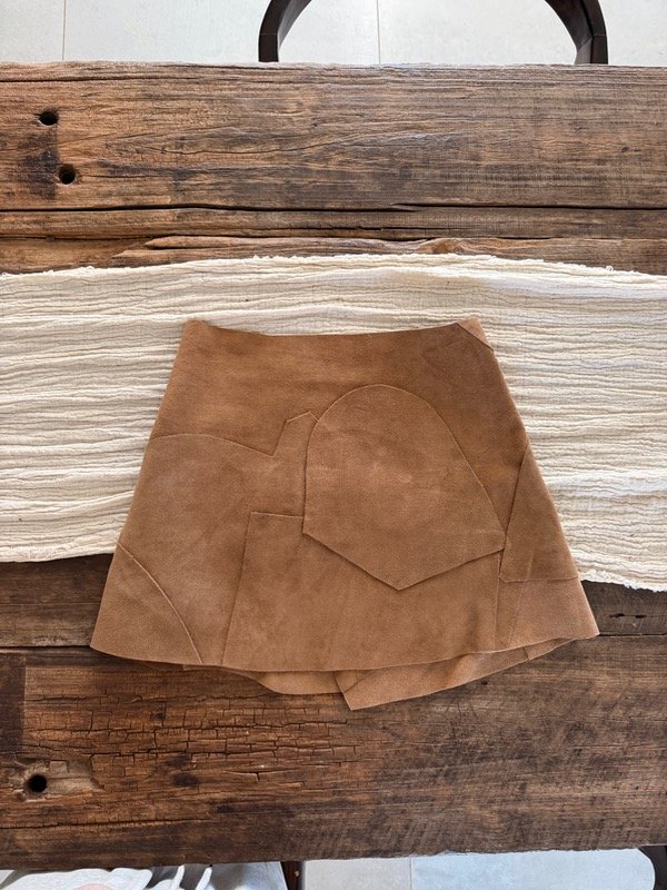 Falda rustica de cuero vacuno, realizada con retazos en su forma mas organica.