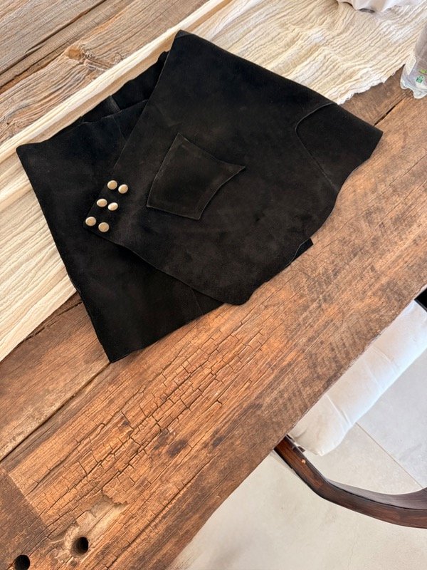 Falda rustica de cuero vacuno, realizada con retazos en su forma mas organica.