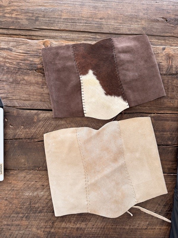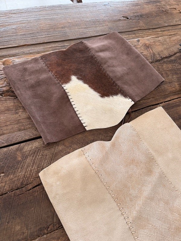 Mix de gamuza, cuero crudo, pelo vacuno, y cueros texturados.