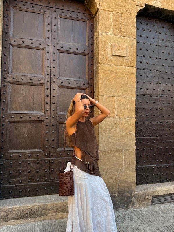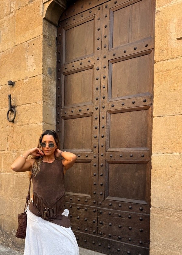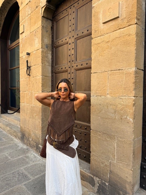 Top de cuero vacuno gamuzado, con terminación frontal en pico y flecos de cuero.