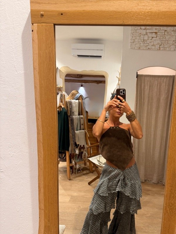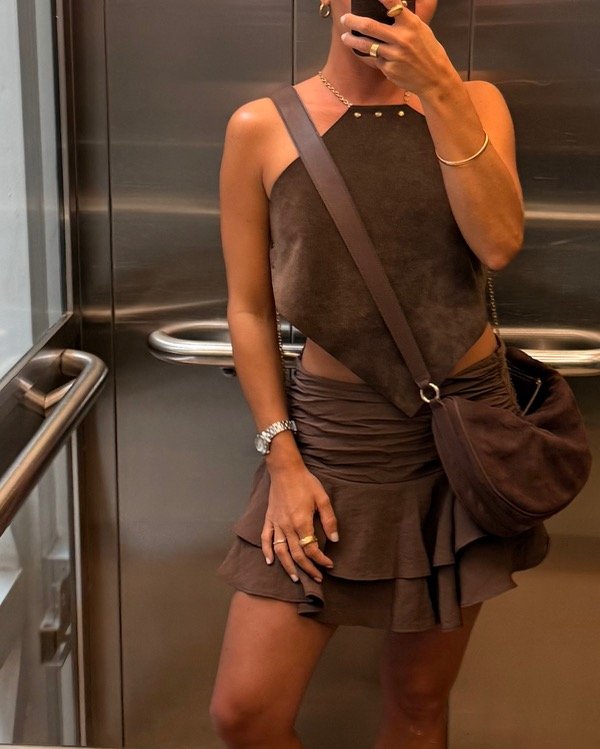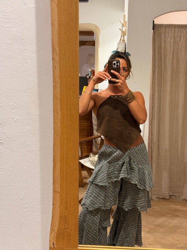 Top de cuero vacuno gamuzado, con terminación en pico y espalda completamente descubierta. Tiras en hombros con cadena, que cruzan en espalda y caen sobre los laterales.