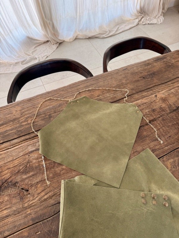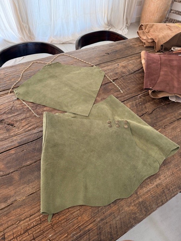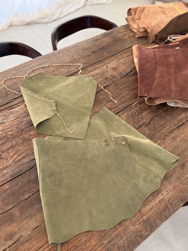 Top de cuero vacuno gamuzado, con terminación en pico y espalda completamente descubierta. Tiras en hombros con cadena, que cruzan en espalda y caen sobre los laterales.